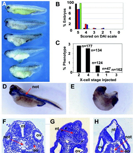 Fig. 3. Phenotypic effects of δNXMyD88 mRNA on axis formation: embryos were injected dorsally into both blastomeres at two-cell stage, based on pigmentation differences between the prospective dorsal and ventral sides (see Section 4.2 for details). (A) Series of typical axis truncations induced by injection of δNXMyD88 mRNA (50 pg). From top to bottom: no effect (DAI 5), reduced forehead (DAI 4), cyclopia (DAI 3), microcephalic and headless (DAI 2). (B) Phenotypic spread of embryos: black, uninjected control embryos (n=234); red, embryos injected with 50 pg (n=162) or blue, injected with 1000 pg (n=210) δNXMyD88 RNA; green, rescue experiment with embryos coinjected with 50 pg δNXMyD88 RNA and 100 pg XMyD88 (n=117). (C) Phenotypic penetrance as a function of injection timing. X-axis indicates the developmental stage, at which δNXMyD88 RNA was injected. (D,E) δNXMyD88-injected embryos lacked notochord (MZ15 staining): (D) Control embryo; (E) δNXMyD88-injected embryo (DAI 2). (FâH) Sagittal sections through δNXMyD88-injected embryos at the level of the otic vesicle (ot, otic vesicle; nt, neural tube; not, notochord, so, somites): (F) Control embryo; (G) microcephalic embryo without notochord, impaired neural tube and somite structure; (H) cyclopic embryo with slightly aberrant somites. Nâ¥3 independent experiments.