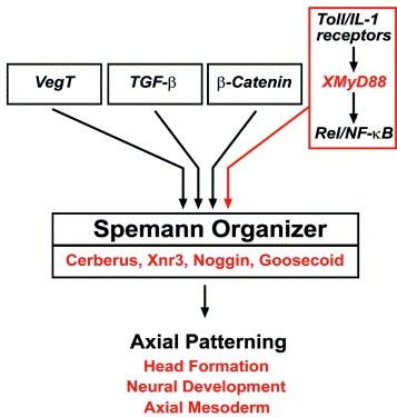 Fig. 5. Model of the contribution of XMyD88-mediated signaling to early embryonic pattern in relation to other key regulatory pathways.