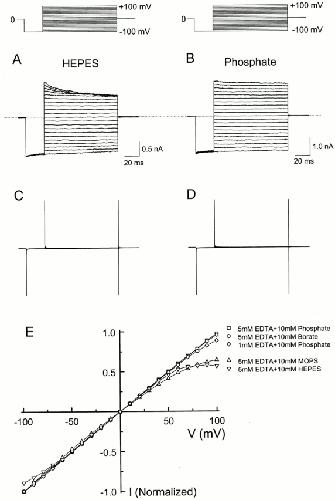 Figure 1. Current–voltage relationship of the IRK1 channel in the presence of various pH buffers. (A and B) Current traces recorded from inside-out patches at membrane voltages between −100 and +100 mV in 10-mV increments, corrected for the background currents shown in C and D, respectively. Both intracellular and extracellular solutions contain either HEPES (A) or phosphate (B). The dashed lines identify the zero-current levels. (E) Normalized steady state I-V curves with intracellular solutions containing (mM): 10 phosphate and 5 EDTA (□), 10 borate and 5 EDTA (○), 10 phosphate and 1 EDTA (⋄), 10 MOPS and 5 EDTA (▵), and 10 HEPES and 5 EDTA (▿). In each case, the extracellular pH buffer was the same as in the intracellular solution. |