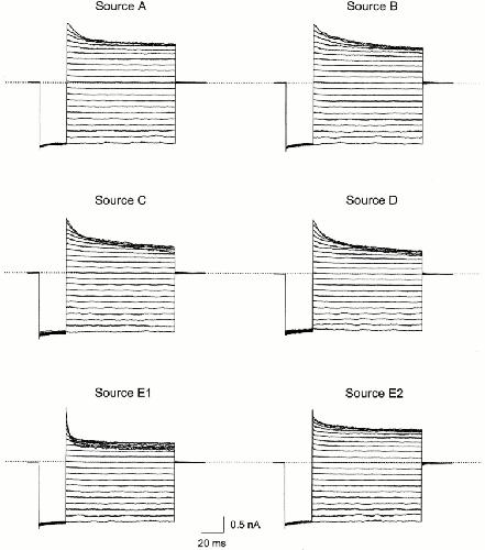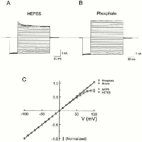 Figure 5. IRK1 current in the presence of 10 mM HEPES from different sources in the intracellular solution. All current traces were obtained from the same patch. The voltage protocol was as in Fig. 1. The extracellular solution contained 10 mM phosphate but no HEPES. |