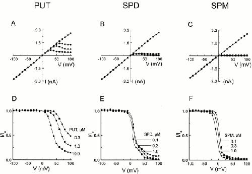 Figure 7. Current–voltage relation of the IRK1 channel in the presence of intracellular di- and polyamines. (A–C) Steady state I-V curves in the absence or presence of various concentrations of intracellular putrescine, spermidine, or spermine. (D–F) Ratios of the I-V curves with and without putrescine, spermidine, or spermine shown in A–C. The concentrations of the blockers were as indicated. The curves superimposed on the data in D or in E and F are fits of Eqs. 2 and 6, respectively, of Guo and Lu 2000a. Parameter values obtained from the fits are as follows (mean ± SEM; n = 3). For putrescine, K1 = 8.2 (± 0.9) × 10−4 M, Z1 = 1.9 ± 0.2; k−2/k−1 = 4.0 (± 0.5) × 10−2, “z−1 + z−2” = 1.6 ± 0.1. For spermidine, Ka1 = 3.9 (± 0.5) × 10−6 M, Za1 = 5.4 ± 0.4; ka−2/ka−1 = 2.7 (± 0.4) × 10−2, “za−1 + za−2” = 5.6 ± 0.4; Kb1 = 4.5 (± 0.6) × 10−5 M, Zb1 = 3.3 ± 0.4; kb−2/kb−1 = 2.0 (± 0.2) × 10−3, “zb−1 + zb−2” = 3.4 ± 0.5. For spermine, Ka1 = 2.4 (± 0.3) × 10−7 M, Za1 = 5.5 ± 0.4; ka−2/ka−1 = 3.5 (± 0.4) × 10−2, “za−1 + za−2” = 5.7 ± 0.5; Kb1 = 6.8 (± 0.7) × 10−6 M, Zb1 = 3.6 ± 0.3; kb−2/kb−1 = 6.9 (± 0.8) × 10−4, “zb−1 + zb−2” = 3.5 ± 0.4. |