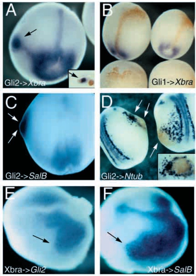 Xbra. In each part, arrows point to sites of ectopic gene expression.