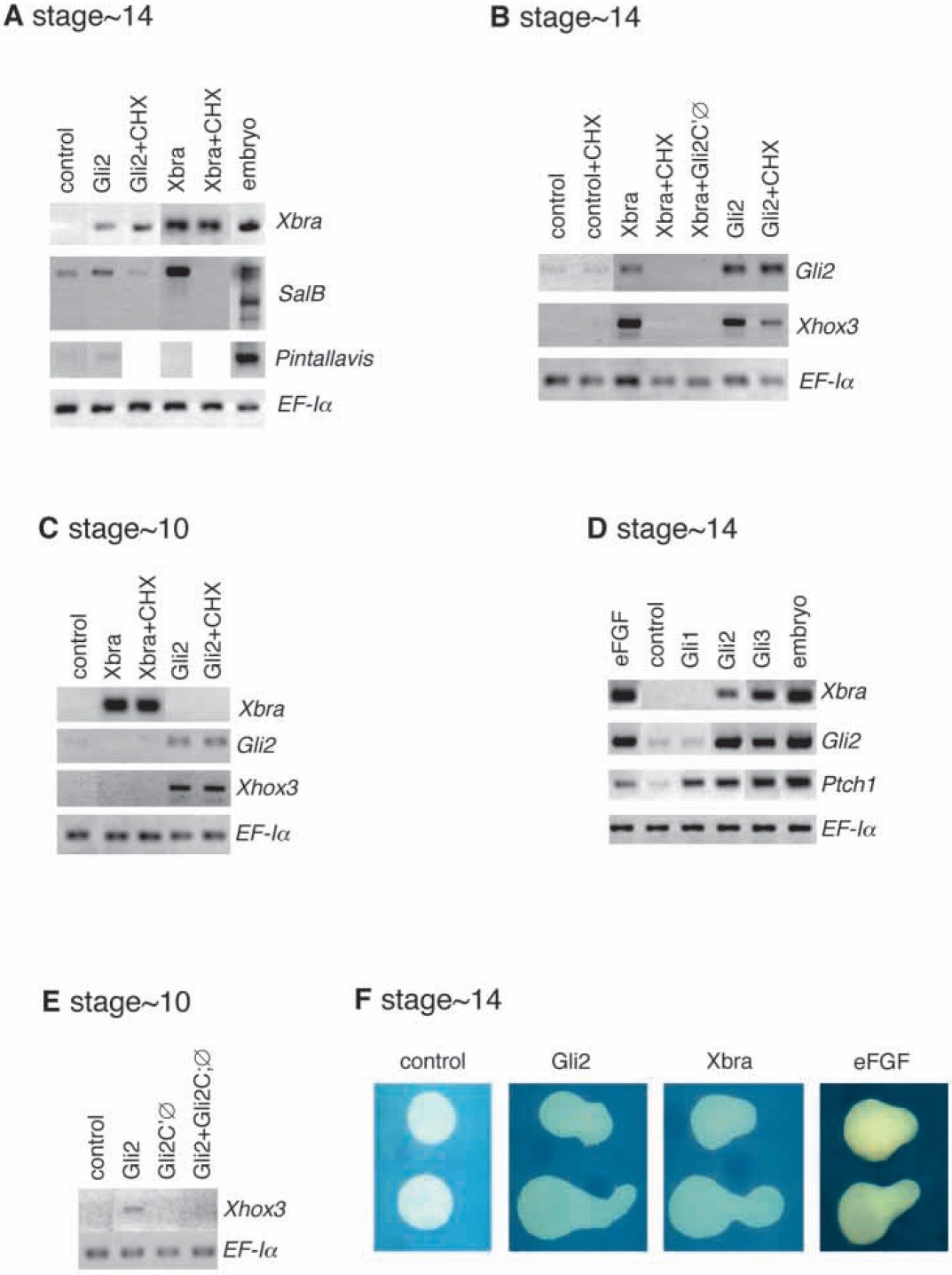 Gli2 inhibits Xbra (arrows and bracket) by co-expressed eFGF in a