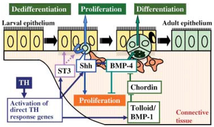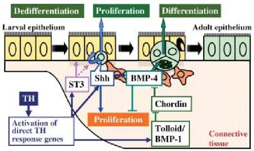 During amphibian metamorphosis the digestive tract is extensively remodeled under the control of epithelial-connective tissue interactions. At the cellular level, larval epithelial cells undergo apoptosis, while a small number of stem cells appear, actively proliferate, and then differentiate to form adult epithelium that is analogous to its mammalian counterpart. Therefore the amphibian digestive tract is a unique model system for the study of postembryonic organ regeneration. As amphibian intestinal remodeling can be triggered by thyroid hormone (TH), the molecular mechanisms involved can be studied from the perspective of examining the expression cascade of TH response genes. A number of these genes have been isolated from the intestine of Xenopus laevis. Recent progress in the functional analysis of this cascade has shed light on key molecules in intestinal remodeling such as matrix metalloproteinase-11, sonic hedgehog, and bone morphogenetic protein-4. These genes are also thought to play key roles in organogenesis and/or homeostasis in both chick and mammalian digestive tract, suggesting the existence of conserved mechanisms underlying such events in terrestrial vertebrates. In this article, we review our recent findings in this field, focusing on the development of adult epithelium in the X. laevis intestine.
