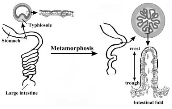 intestine. (A) In a wild type tadpole before metamorphosis, the