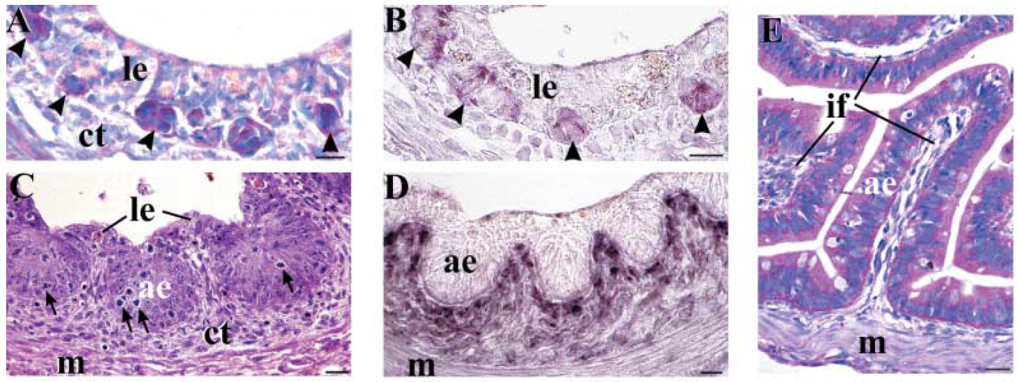 (arrowheads) appear as islets between the larval epithelium (le) and the connective tissue (ct). They are stained deep red with methyl