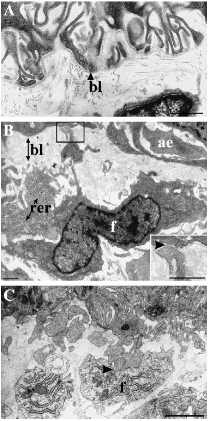 basal lamina (bl) remains thin and continuous. (B) In a wild type