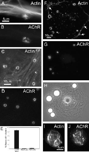 Figure 2. F-actin assembly at AChR clusters induced by HB-GAM beads. A, C, F, and I, Rh-phalloidin labeling; B, D, G, and J, OG-BTX labeling. (A and B) F-actin at an AChR hot spot in a thin lamella region. Phalloidin-labeled myofibrils and F-actin at AChR cluster. (C, D, and F–J) Jasplakinolide pretreatment to mask preexisting F-actin before bead stimulation. The beads induced spatially discrete actin polymerization and AChR clustering as shown in two examples (C and D and F–H). In addition to sites of bead–muscle contacts, new F-actin assembly was also seen at filopodia and lamellipodia at the cell periphery (F, arrows). H is a phase image of the cell shown in F and G. At higher magnification (I and J), the punctate and circumferential pattern of new F-actin can be seen. The F-actin and AChR patterns are not congruent. (E) Quantification of F-actin and AChR induction by beads. The majority of beads induced both specializations (correlation coefficient 0.987). Data from 40 cells are pooled. |