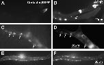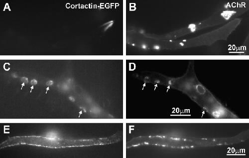 Figure 4. Cortactin-EGFP expression. (A and B) In unstimulated cells, cortactin was concentrated at membrane lamellae and often showed no colocalized with AChR hot spots. (C and D) Bead-induced AChR clusters were marked by cortactin localization. (E and F) Agrin induced association of cortactin with membrane areas encompassing AChR clusters. |