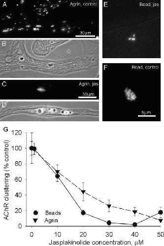 Figure 9. Inhibition of AChR clustering by jasplakinolide. (A–D) Agrin-induced cluster formation was inhibited by jasplakinolide, but the hot spot was retained. (E and F) Bead-induced clustering was also inhibited. Clusters that formed in the presence of jasplakinolide (50 μM) were much smaller than control clusters. (G) Quantification of the inhibitory effect. |