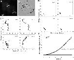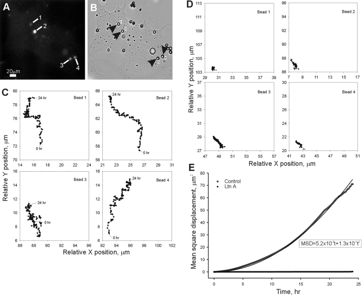 Figure 6. Trajectories of bead/AChR movement. (A and B) Four clusters and their associated beads were followed during a 24-h period. This image was taken at the end of the recording. The trajectories of these four beads are shown in C with the beginning and end points indicated. (D) Except for slow diffusional drift, the bead movement was abolished after Ltn A (1 μM) treatment. (E) MSD plotted against time. The linear slope of Ltn A data provides an estimate of the diffusion coefficient of the bead/AChR complex in the plane of the membrane. The solid curve is a regression fit of the control data using the equation described. From this, an actin-driven bead/cluster movement velocity of 0.1 nm/s is calculated. The R coefficient of the regression is 0.9985. |