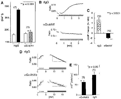 FIG. 6. Gas-coupled b2AR activation elicits IICR that is inhibited by anti-Gas/olf antibodies. (A and B) Normal rabbit IgG- (A) and