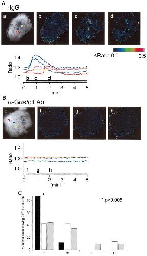 between anti-Gas/olf antibody-injected animal caps (n512) and control normal rabbit IgG-injected animal caps (n510). Peak changes in [cAMP]