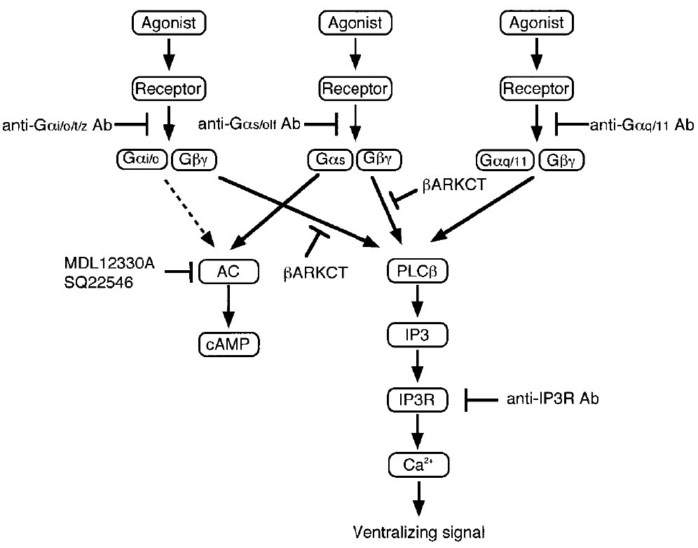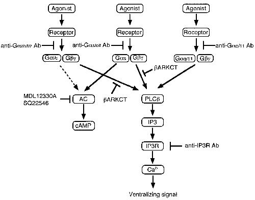 FIG. 7. Schematic drawing of the signaling pathway for the ventralizing signal. Receptor activation by agonists releases Ga and Gbg
