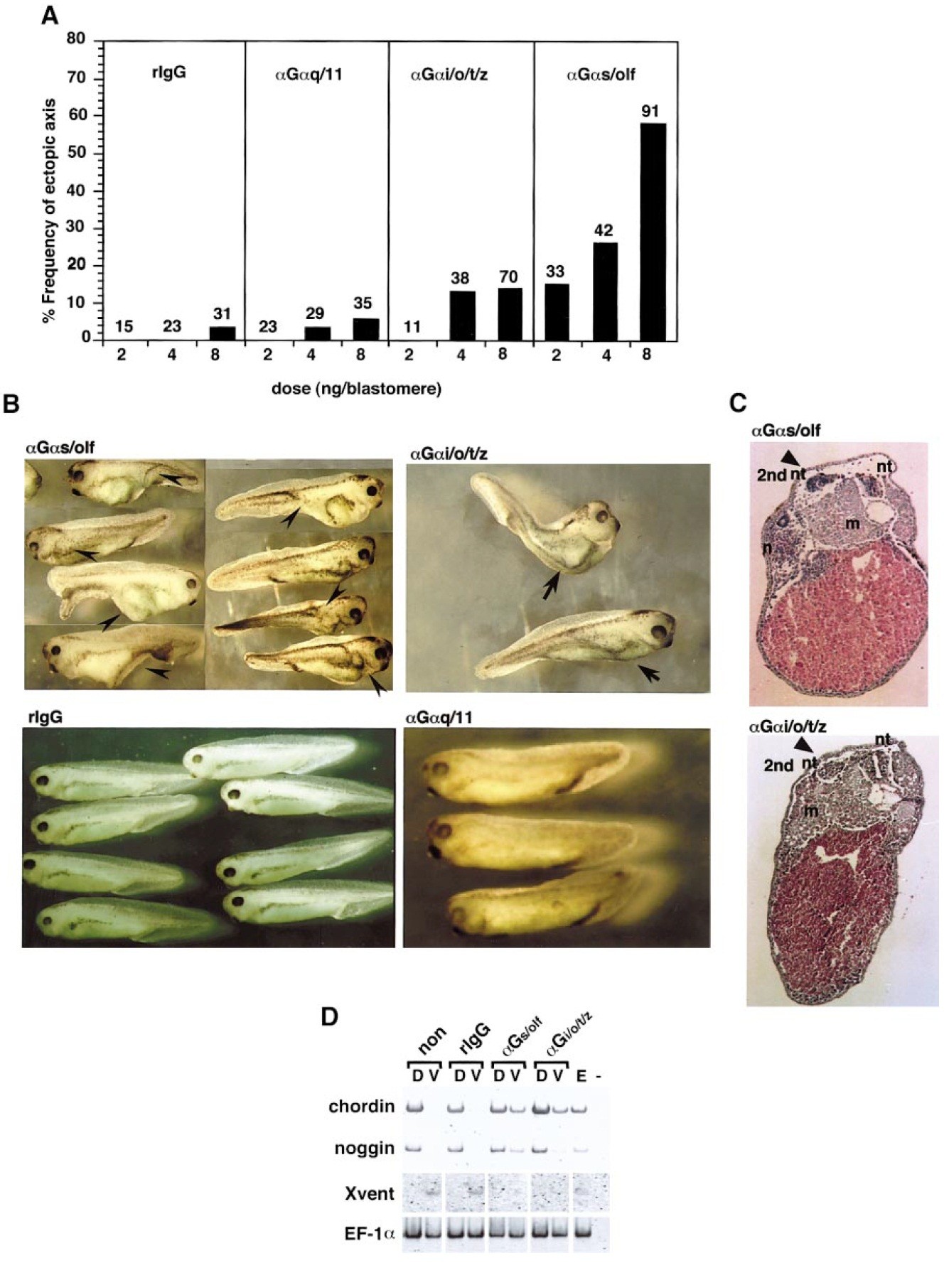 ectopic axis-inducing activity, with a potency of anti-Gs/olf @ anti-Gai/o/t/z. (A) Histogram of frequency of axis duplication induced by