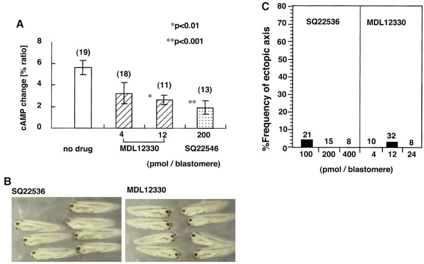 injection of SQ22536 (200 pmol/blastomere) or MDL12330A (12 pmol/blastomere) showed no gross effect on embryonic development. (C)