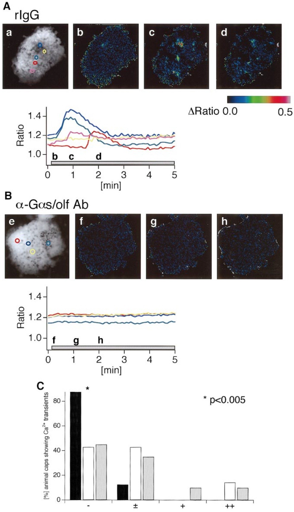 normal rabbit IgG or anti-Gas/olf antibody. Animal caps of blastula stage (stage 8–9) embryos were excised and subjected to calcium imaging. Time course of Ca21 changes (F340/F380 ratio) in cells indicated by circles is plotted by the same colors. (a and e) Fura-2