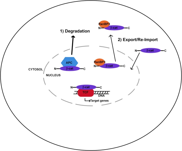 Figure 2. Distinct modes of β-catenin nuclear export. APC-directed export of β-catenin may be coupled to degradation, whereas RanBP3-directed export may allow for cycles of export and reimport. See text for details.