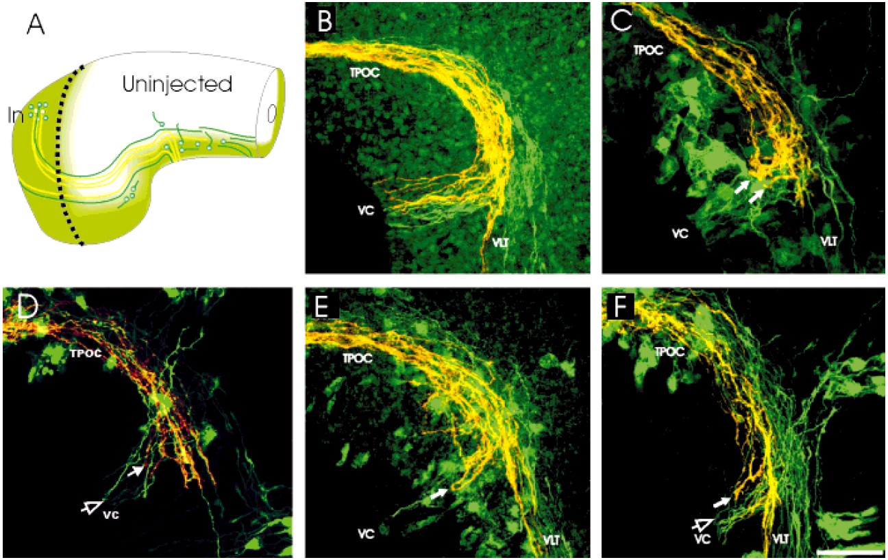 midline. NOC-2 stained (yellow) axons arise from the injected side of the