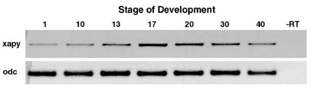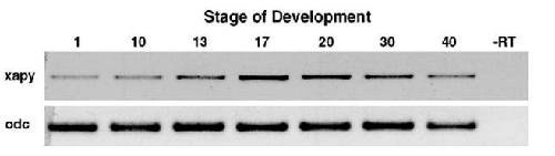 RT-PCR analysis of Xapy mRNA expression during Xenopus development. Polydenylated RNA was prepared from eggs (1), early gastrulae (10), late gastrulae (13), neurulae (17), late neurulae (20), tailbud (30), and tadpole (40). â RT is stage 20 poly (A)+ mRNA minus reverse transcriptase. Xapy mRNA is expressed at all the stages tested. Ubiquitously expressed odc mRNA was used as a control. |
