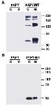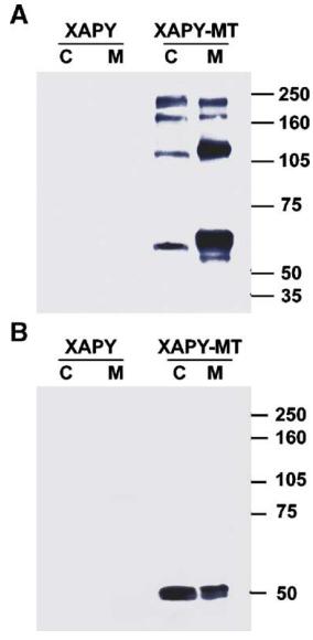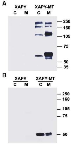 Western blot analysis of transfected HEK cells and culture media. Cell extracts and concentrated media from Xapy and Xapy-mt transfected HEK293 cells were separated by SDS-PAGE in both the absence (A) and presence (B) of reducing agent (β-mercaptoethanol). C = cell extracts, M = conditioned media. Myc-tagged XAPY was detected using the 9E10 monoclonal antibody. Multiple bands are seen in both media and cell extracts under non-reducing conditions, but only one band under reducing conditions. The result demonstrates that XAPY-MT can be secreted. However, since the media is 15à more concentrated that the cell extracts it is clear that most of the protein is detected in cell extracts. |