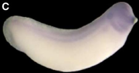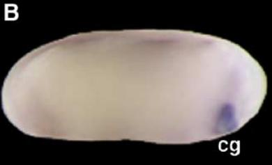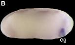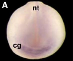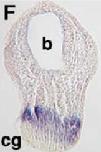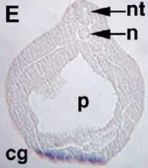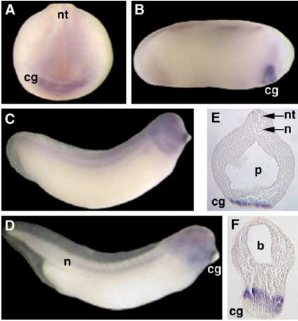 Whole mount in situ hybridisation analysis of Xenopus embryos. (A) Frontal view of stage 18 embryo showing that Xapy is enriched in the developing cement gland (cg), a patch of anterior epidermis just ventral to the neural tube (nt). (B) Lateral view of stage 24 embryo showing that Xapy continues to be expressed the cement gland. (CâD) Lateral view of a stage 30 (C) and a stage 40 (D) embryo showing Xapy expression in the head (h) and notochord (n). Xapy continues to be expressed in the cement gland, but is restricted to the basal region. In (BâD), the head of the embryo is on the right. (EâF) Sections through the head of a stage 20 (E) and a stage 30 (F) embryo, showing that expression is highly enriched in the cement gland. Note that in (F) staining is localized to the basal region of the cement gland. p = pharynx, b = brain. |