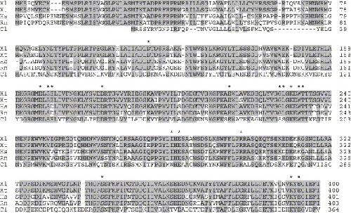 Comparison of amino acid sequences of Apyrases from Xenopus laevis (Xl), Xenopus tropicalis (Xt), human (Hs), rat (Rn), and Cimex lectularius (Cl). The proteins were aligned with the Clustal W software program in MacVector. Minor modifications were made by the authors. Conserved amino acids are indicated by shading. Amino acids that may be critical for binding substrates and for the Ca2+ dependency of the enzyme are indicated (*). The DDBJ/EMBL/GenBank accession numbers for these genes are AJ632336 (X. laevis), AAH61377 (X. tropicalis), AF328554 (human), AJ312207 (rat), AAD09177 (C. lectularius).