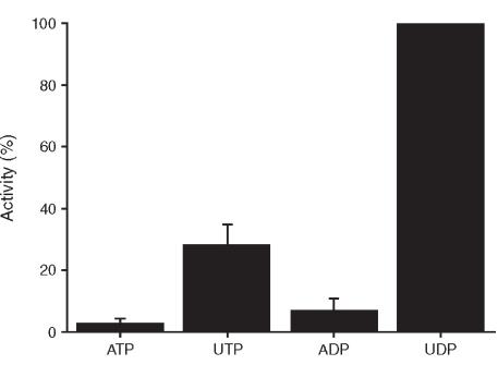 Secreted XAPY is a functional Apyrase. Conditioned media from transfected, and mock transfected, HEK 293 cells was incubated with the indicated substrates and production of phosphate (PPi) measured. The basal level of phosphate production from mock transfected media was subtracted from that of XAPY conditioned media and the data normalized to UDP being 100%. The results show that UDP is the preferred substrate for XAPY. |