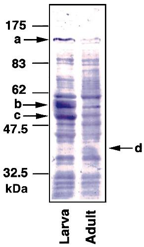 (a) is seen in the larval lane but only faintly in the adult. Larval