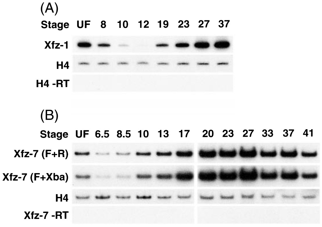 lane) or Xfrizzled-7 (B, right lane) results in expression of both