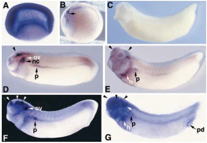 (G) embryos, as well as the proctodeum (pd) of tadpoles