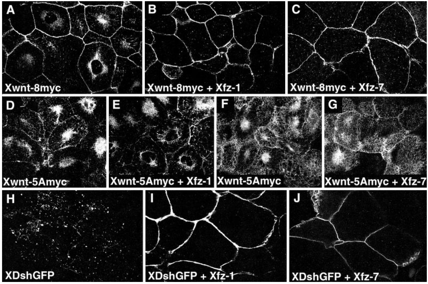 Coexpression of Xfrizzled-1 or Xfrizzled-7 results in a recruitment of Xwnt-8 to the plasma membrane. (E) Xwnt-5A is not recruited by