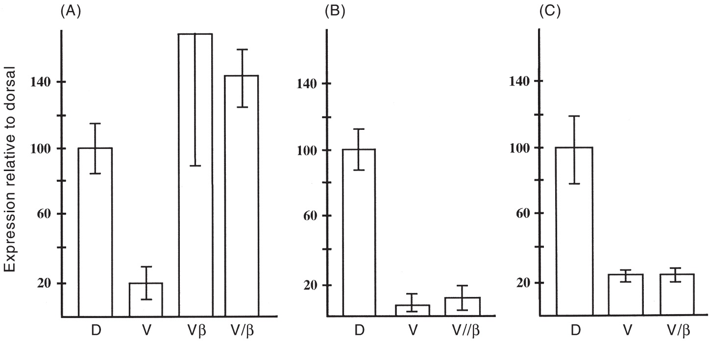 a ventral vegetal (V) or dorsal (D) cell at the 16–32-cell stage, and where indicated (V//b) embryos injected ventrally with the reporter
