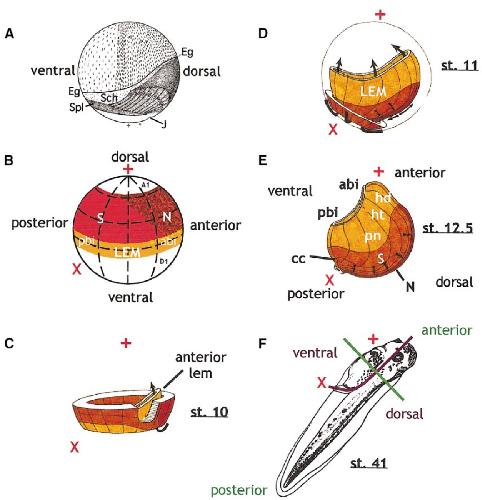 FIG. 1. Summary diagrams for two amphibian fate maps and diagrams of inversion of the marginal zone, including orientations of the anterior/posterior and dorsal/ventral axes of the tadpole. Early embryos (A, B) or marginal zones (CâE) shown are oriented by convention with their upper blastoporal lips on the lower right side. If this orientation could be held constant during morphogenesis by fixing the site of blastopore closure (X) and the animal pole (1), the resulting embryo would be oriented as shown in F. Tracing the inversion of the marginal zone through its morphogenetic movements should facilitate understanding how the prime meridian becomes the embryoâs anterior midline. (A) Axolotl late blastula-to-tailbud fate map (Vogt, 1929), constructed by vital dye mapping technique. The dorsal/ventral axis runs horizontally from the side on which the blastopore lip first forms (J, Spemannâs upper lip, Morganâs dorsal lip) to the side on which the lip forms last (Spemannâs lower lip, Morganâs ventral lip). The notochord is shown in heavy stippling on the dorsal side. The first 10 somites are indicated by numbers, the remainder of the prospective somite field is faintly stippled (Sch). Translations for other abbreviations include Eg, the limit of involution, and Spl, lateral plate mesoderm. In the animal region, the neural field is indicated by heavy dashed lines and the epidermal field by faint dashed lines. (B) Revised fate map for Xenopus laevis mesoderm, early blastula-to-tadpole (st. 6â41), constructed by lineage labeling (Lane and Smith, 1999). The anterior/posterior axis runs horizontally from the upper lip to the lower lip. The dorsal/ventral axis for the mesoderm (as well as the endoderm) runs from animal to vegetal. Two landmarks used by Vogt and Keller are indicated on the new Xenopus map: X marks the approximate site at which the blastopore lips close at st. 13; 1 marks the animal pole, which ultimately forms epidermis covering the heart. Notochord, N, and somites, S. (C) The marginal zone at st. 10. Anterior leading edge mesoderm (which will give rise to the anterior blood islands, head mesoderm, heart mesoderm, and liver) has begun its migration toward the animal pole, and dorsal mesoderm located just animal to the anterior leading edge mesoderm is displaced slightly toward the vegetal pole. (D) The marginal zone at st. 11. The leading edge mesoderm (LEM) through all 360° is internalized and migrating toward the animal pole, with anterior LEM advanced the farthest. Convergence within the prospective notochordal and somitic fields causes involution of the upper (dorsal) marginal zone and results in the blastopore constricting eccentrically in relation to the vegetal pole. (E) The marginal zone at st. 12.5. Anterior LEM migrates past the animal pole, where it will settle to form the anterior blood islands, abi; head mesoderm, hd; and heart, ht. Posterior LEM will give rise to the posterior blood islands, pbi, and other lateral plate derivatives, as well as the pronephros, pn, which is intermediate mesoderm. Converging posterior, dorsal mesoderm (prospective notochord and somites) forms a circumblastoporal collar, cc, around the closing blastopore, while posterior LEM cells are displaced from the blastopore. (F) St. 41 tadpole, oriented as if it had been held in place during development. The solid green line, separating anterior from posterior, is placed at the approximate level of somite 7, which evidence indicates is the connecting point between the head and the trunk in most vertebrates. The solid purple line separates dorsal from ventral. This series of diagrams illustrates how the prime meridian becomes the anterior midline during morphogenesis. A1 and D1 blastomeres are labeled in B to indicate orientation. |