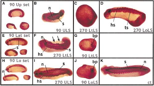 FIG. 5. Results of specification testing, evaluated by immunostaining for notochord (Tor 70) and muscle (12-101) differentiation, at late tailbud stage. (A, E, H) Lateral views of control embryos and matched sets, made as diagrammed in Fig. 3A. The fragment that contains the prime meridian is shown on the lower left and the matched fragment, which lacks a prime meridian, is shown on the lower right. (B) 90° ULS, dorsal view. (C) 270° LoLS, no axial mesoderm. (D) 270° LoLS, with one somite file containing head and trunk somites, lateral view. (F) 270° LtLS, dorsal view. (G) 90° LtLS, no axial mesoderm. The pigmented patch (bp) is the closed blastopore/proctodeum. (I) 270° ULS, dorsal view. (J) 90° LoLS, no axial mesoderm. (K) Control embryo, dorsal view. hs, head somites; n, notochord; s, somites; ts, trunk somites. |
