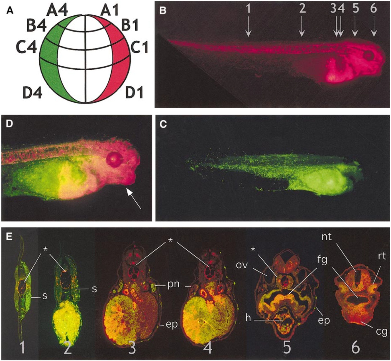 FIG. 2. Fate of column 1 blastomeres. At st. 6, one of each of the column 1 blastomeres was injected with rhodamine dextran and one of each of the column 4 blastomeres was injected with fluorescein dextran. (A) Diagram of the lineage labeling scheme. (B, C) Distributions of rhodamine dextran and fluorescein dextran, respectively, at st. 41. Arrows in B refer to the positions of the sections shown below in E. (D) Colocalization of both dextrans. The arrow marks anterior, ventral structures, which, by definition, are not dorsal structures. Essentially all head structures originate from column 1 blastomeres. (E) Colocalization of column 1 and 4 progeny in sectioned, st. 41 embryo. Section 1 is posteriormost and section 6 is anteriormost. See text for discussion. The asterisk indicates the notochord/floor plate/central somite domain, which is labeled throughout the embryo by column 1 blastomeres. Abbreviations used: cg, cement gland; ep, epidermis; fg, foregut; h, heart; nt, neural tube/brain; ov, otic vesicle; pn, pronephros; rt, retina; s, somite. |