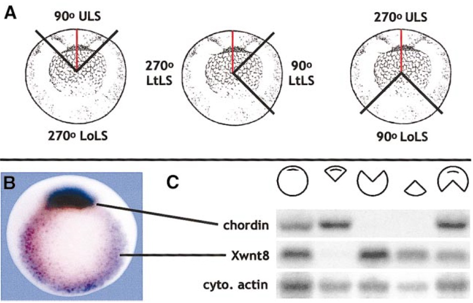 FIG. 3. Surgical dissection of early gastrulae and assessment of surgical accuracy. (A) Diagram of the surgery at st. 101, viewed from the vegetal pole, and nomenclature of the six fragment types to be analyzed by specification testing. The prime meridian is shown in red. Incisions run along meridians from the animal to the vegetal pole, deep to the central axis, separating embryos into 90° and corresponding 270° sectors. ULS, upper lip sector; LtLS, lateral lip sector; LoLS, lower lip sector. (B) Double in situ hybridization at st. 101 for chordin (blue), expressed at the upper lip, and Xwnt8 (purple), expressed in nonorganizer meridians of the marginal zone. (C) Northern blot analysis of chordin and Xwnt8 as an indication of surgical accuracy. Total RNA was extracted from eight embryos or fragments; two embryo or fragment equivalents were analyzed per lane. Intact controls (lane 1), 90° ULS (lane 2), 270° LoLS (lane 3), 90° LoLS (lane 4), and 270° ULS (lane 5) were probed for chordin and Xwnt8. cytoskeletal actin was probed as a loading control. |