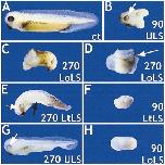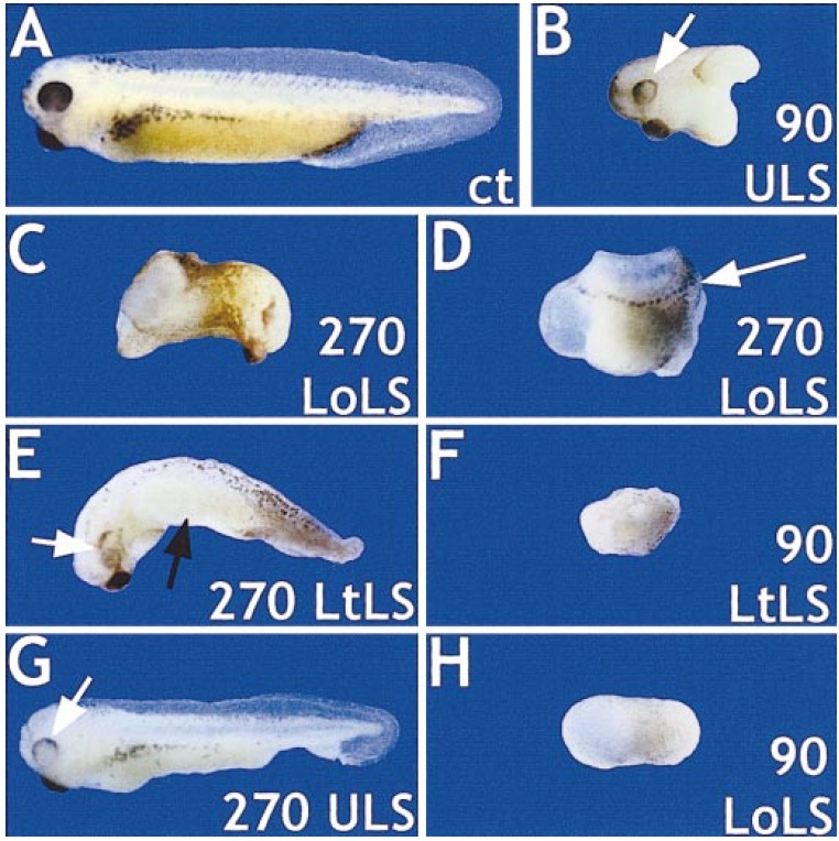 FIG. 4. Results of specification testing, evaluated by morphology. Fragments generated by surgery at st. 101 were cultured to early tadpole stage. For specimens with detectable axes, anterior is to the right and dorsal is up. (A) Control embryo. (B) 90° ULS, with retina and cement gland. (C) 270° LoLS, lacks apparent axial structures. The concentrated pigment patch seen at one end of the specimen is not a cement gland. (D) 270° LoLS, with axial structure. At higher magnification (not shown), somites are seen in the region above the stripe of pigmented cells (arrow). (E) 270° LtLS, with large open wound (black arrow). The head includes two pigmented retinas (one indicated by white arrow) and a cement gland. (F) 90° LtLS, with no apparent axial structures. (G) 270° ULS, with wound in the region of the proctodeum. (H) 90° LoLS, with no apparent axial structure. |