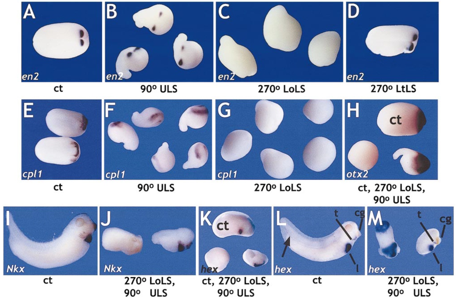 FIG. 6. Results of specification testing, evaluated for anterior marker genes by in situ hybridization. (A) Late neurula control, en2, dorsal view. (B) 90° ULS expresses en2. (C) 270° LoLS does not express en2. (D) 270° LtLS expresses en2, dorsal view. (E) Late neurula controls express cpl1, almost lateral (top) and dorsal (bottom) views. (F) Five 90° ULS express cpl1. (G) Five 270° LoLS do not express cpl1. (H) otx2 expression in st. 20 control (top), 270° LoLS (bottom left, negative), and 90° ULS (bottom right, positive). (I) Control st. 35 expresses Nkx2-5 in heart and pharyngeal arches. (J) 270° LoLS (left, negative) and 90° ULS (right, positive) expression of Nkx2-5. (K) XHex expression in control st. 24 (top), 270° LoLS (bottom left, negative), and 90° ULS (bottom right, positive). (L) XHex expression in control st. 35. Expression in vascular endothelial cells is marked by an arrow. (M). XHex expression in 270° LoLS (left, two domains positive) and 90° ULS (right, presumably in the thyroid, t, and liver, l, as in the control embryo). cg, cement gland. |