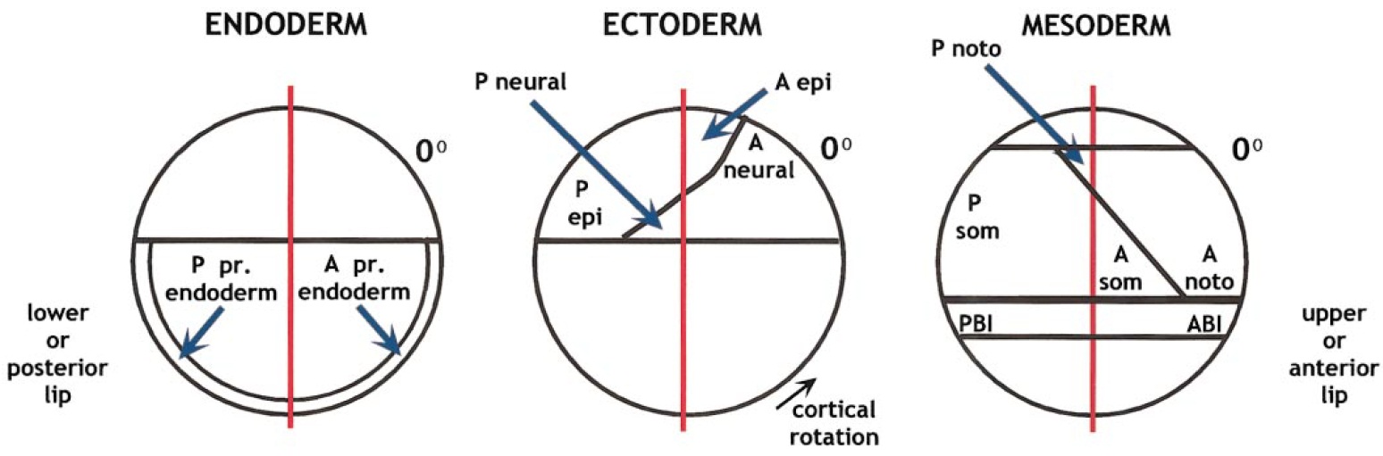 FIG. 11. Schematic representation of the distributions of the anteriormost and posteriormost tissues of the germ layers, in relation to the prime meridian established by cortical rotation. The anteriormost tissues of the three germ layers arise from cells along the prime meridian, whereas the posteriormost tissues of the three germ layers arise from cells on the opposite side of the embryo. A line (red) separating the anteriormost and posteriormost tissues can be drawn. See text for explanation. Primitive endoderm (the archenteron) arises from the surface cells of the vegetal hemisphere and the epithelial layer of the marginal zone. Mesoderm arises predominantly from the deep cells of the marginal zone. Ectoderm arises from both the deep and the surface layers of the animal hemisphere. The direction of cortical rotation is indicated. |