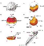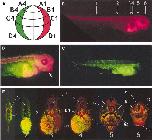 FIG. 9. Primary data adapted from Vogtâs axolotl fate map (Fig. 3 in Vogt, 1929; reproduced by permission of the publisher). Vogtâs labels are indicated in red or blue, corresponding to the color of the dye mark. Labels we added to facilitate discussion are shown in black. (A) The dorsal/ventral distribution of the three germ layers, illustrated schematically in a sagittal cross section of a tadpole. Following the standards of classical embryology, derivatives of the ectoderm are shown in blue, derivatives of the mesoderm in red, and derivatives of the endoderm in yellow. Graded colors indicate the dorsal/ventral distribution within a germ layer. Shades (colors tinged with black) represent dorsal tissues and tints (colors mixed with white) represent ventral tissues. For example, as dorsal endoderm, the archenteron roof is shown in dark yellow, and as ventral endoderm, the archenteron floor is shown in pale yellow. (B) Vogt placed a series of alternating red and blue vital dye marks along the prime meridian blastula (shown in lateral view, with the prime meridian to the right). (C) The upper lip appears subsequently, between marks 7 and 8 (gastrula shown in vegetal pole view, with the prime meridian up). (D) At neural plate stage, marks 1â4 are visible in the neural groove in an anterior-to-posterior sequence (neurula shown in dorsal view, anterior is left). (E) The final distribution of the dye marks (tailbud shown in sagittal section, anterior to the left). (F) To present the embryo in a somewhat Cartesian mode, we straightened the tailbud in (E). This emphasizes the ventral distribution of marks 8â11. The purple line approximates the final distribution of the bottle cells that formed the blastopore and thus separates dorsal from ventral endoderm. See text for full explanation. Extensive morphogenesis must still occur to generate a tadpole from a tailbud, but marks on the left side of the green line in (F), including 3 and 11, will reside in the tadpoleâs head. As the tail organizer takes over production of the axis, a tail that consists almost entirely of dorsal derivatives is built. Thus, the tail is included in the dorsal territory in Fig. 1B. |