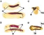 FIG. 8. Results from 70° ULS excision, stained for notochord and somites. Anterior is to the right. (A) Lateral view of a 290° LoLS that healed completely and formed the posterior body plan (top), with notochord and somites arranged in bilateral symmetry, and a control embryo (bottom). (B) Dorsal view of the same specimens. (C) Lateral view of a 70° ULS. The cement gland (cg) and somitic mesoderm (s) are indicated. The faint shadow between these two structures is the notochord, which is below the focal plane. (D) Dorsal view of a 290° LoLS that did not heal. Endoderm is exposed at the surface between the two somite files. |