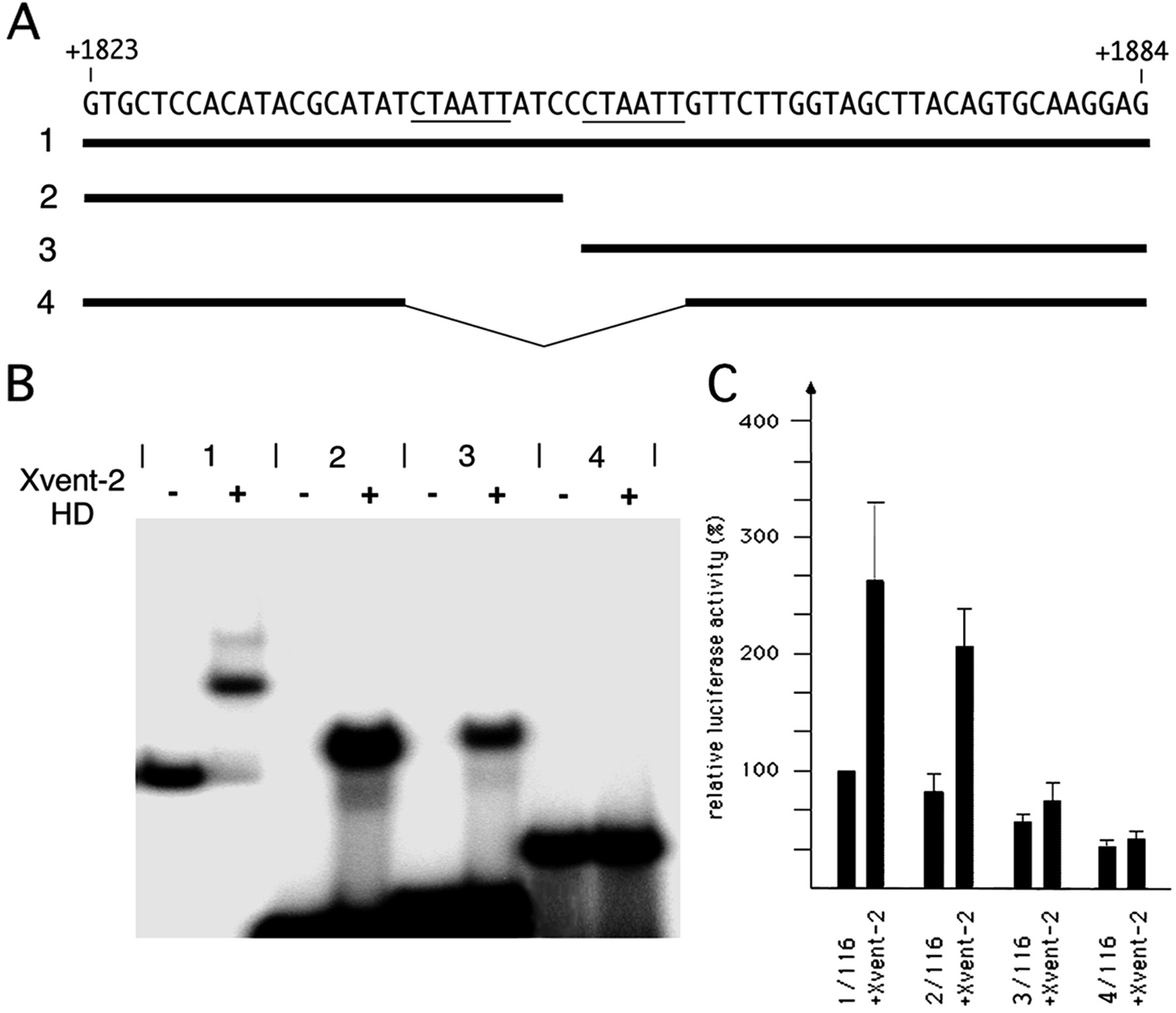 Delineation of Xvent-2 responsive region. A and B, double stranded oligonucleotides (5′ elongated by a KpnI (forward) or aXhoI (reverse) site) comprising positions +1823 to +1884 (1), +1823 to +1850 (2), +1852 to +1884 (3), and +1823/+1884 deleted from +1842 to +1857 (4) were subjected to gel mobility shifts with the Xvent-2 homeodomain as described in the legend to Fig. 4. Note that there is no shift when both copies of the core motif (underlined) are deleted but that one copy is sufficient for binding. C, fragments were subcloned in front of the −116/+54 basalBMP-4 promoter fused to the luciferase reporter. 20 pg of DNA constructs were co-injected with 500 pg of Xvent-2 RNA into dorsal blastomeres of four-cell stage embryos. Reporter activity of the complete fragment is set as 100%. Note that neither the internal deletion nor the 3′ fragment containing one copy of the core motif can be activated by Xvent-2. |