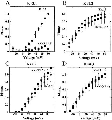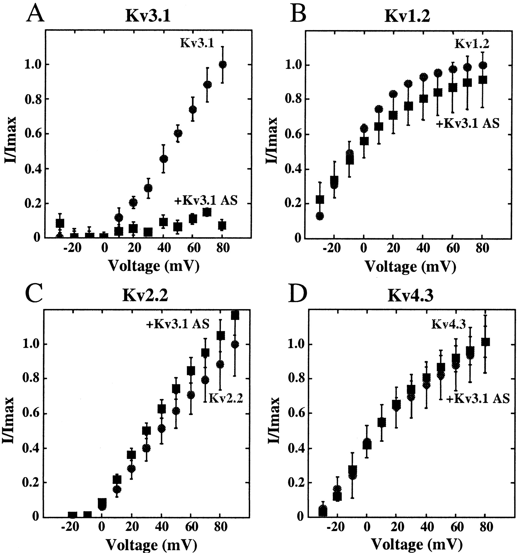 Antisense (AS) RNA to xKv3.1specifically inhibits the current expressed in oocytes injected withxKv3.1 mRNA. Currents were recorded after injection of cRNA encoding xKv genes ± xKv3.1AS. Currents recorded in the presence of AS were normalized to those recorded from oocytes of the same clutch in the absence of AS.A, xKv3.1 AS was injected at a stoichiometry of 4:1 with xKv3.1 RNA. AS decreased the current by 86% without shifting the I–V relation.B–D, xKv3.1 AS had no significant effect on currents encoded by xKv1.1, xKv2.1, orxKv4.3 when mRNA was injected at the same stoichiometry.Circles, xKv RNA alone;squares, xKv RNA plusxKv3.1 AS. n ≥5 for each gene. |