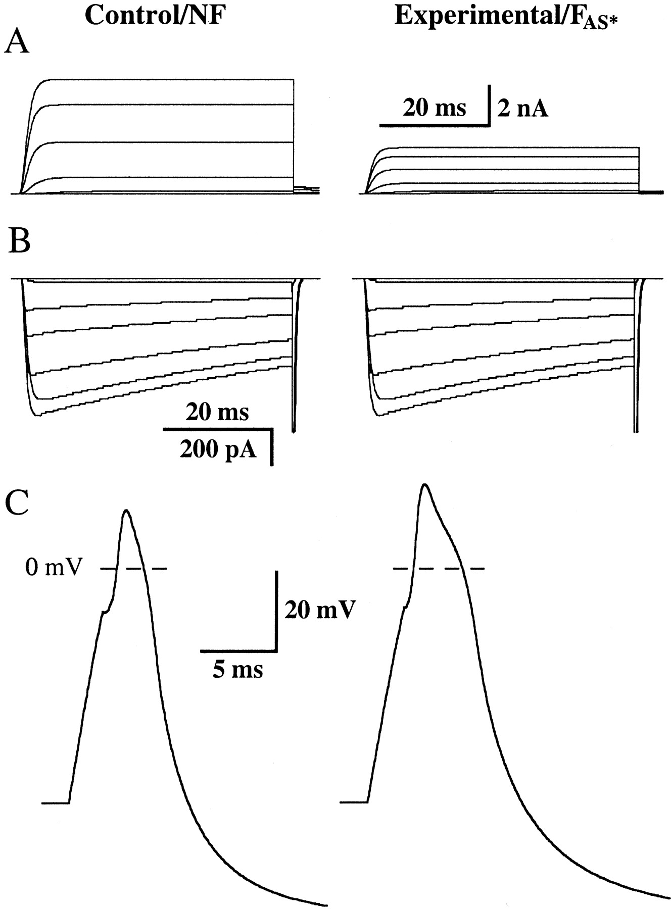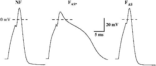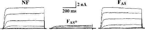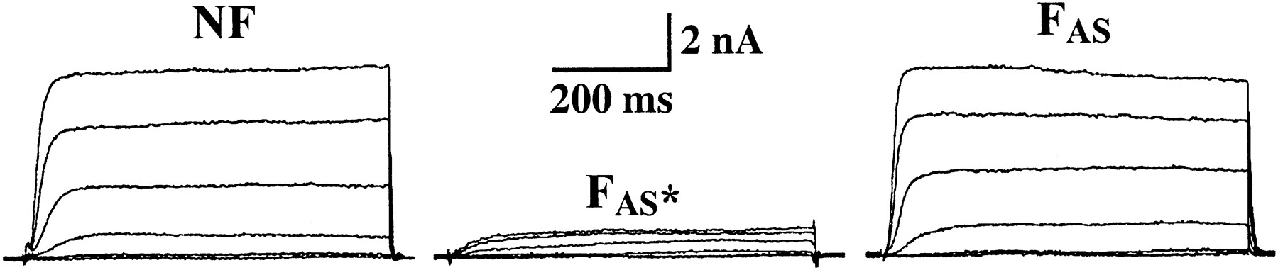 xKv3.1 AS increases action potential duration. The AP of FAS* neurons is longer in duration than that of NF and FAS neurons (p < 0.01), consistent with reduction of the amplitude of I Kv. The records are from three neurons at 1 d in culture; n = 24. |