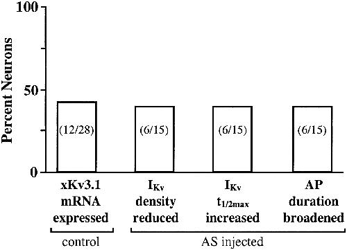 The percentage of neurons in whichI Kv and APs are affected byxKv3.1 AS is similar to the percentage of neurons previously shown to express xKv3.1 transcripts (Gurantz et al., 2000). Numbers in parenthesesindicate the number of neurons affected/tested for each condition. |
