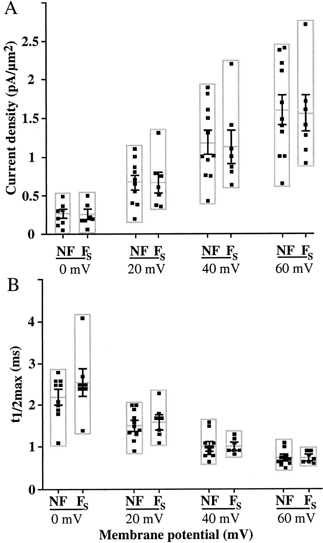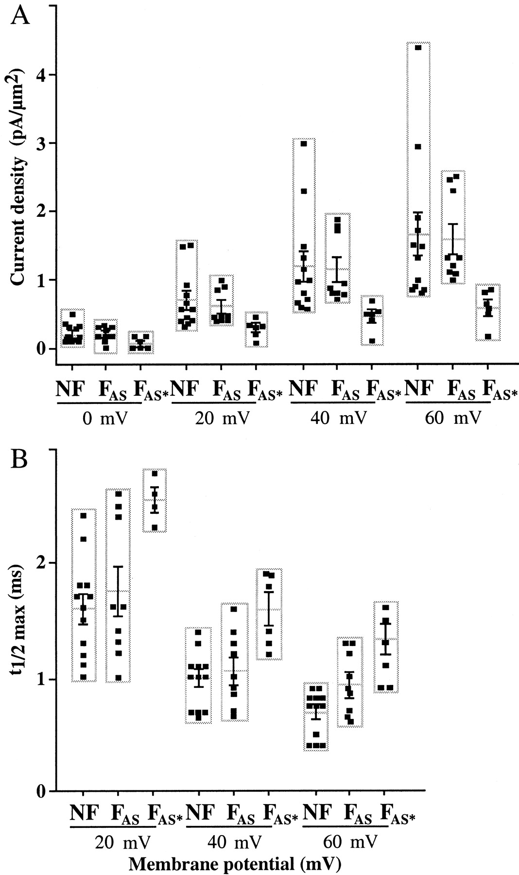 Properties of I Kv in FAS* neurons. Currents were recorded at 18–22 hr in culture. A, Current densities of FAS*neurons are reduced relative to those of NF and FASneurons. FAS* cells show a mean 62 ± 1% decrease in current density at 0 to +60 mV (p < 0.01), whereas FAS cells have currents that are not different from NF controls. The boxes include all measurements from cells at a particular voltage. Horizontal bars indicate the means for these measurements, and vertical barsindicate SEMs. NF, Nonfluorescent;F AS, fluorescent, but unaffected by AS;F AS*, fluorescent, affected by AS. Values were designated FAS* when they exceeded 2 SD from the mean values for NF neurons in the same culture dishand thus in some cases overlap the values for NF neurons recorded in other cultures; n = 27. B, Times to half-activation (t 1/2max) of FAS* neurons are increased relative to those of NF and FAS neurons. FAS* cells show a 66 ± 6% increase in t 1/2max at +20 to +60 mV (p < 0.01), whereas FAS cells have currents that are not different from NF controls. Values at 0 mV are not shown because I Kv is small and slowly activating at this potential in FAS* neurons, and discrimination from noise is ambiguous; n = 27. Noise precluded measurement from two cells at +20 mV. |