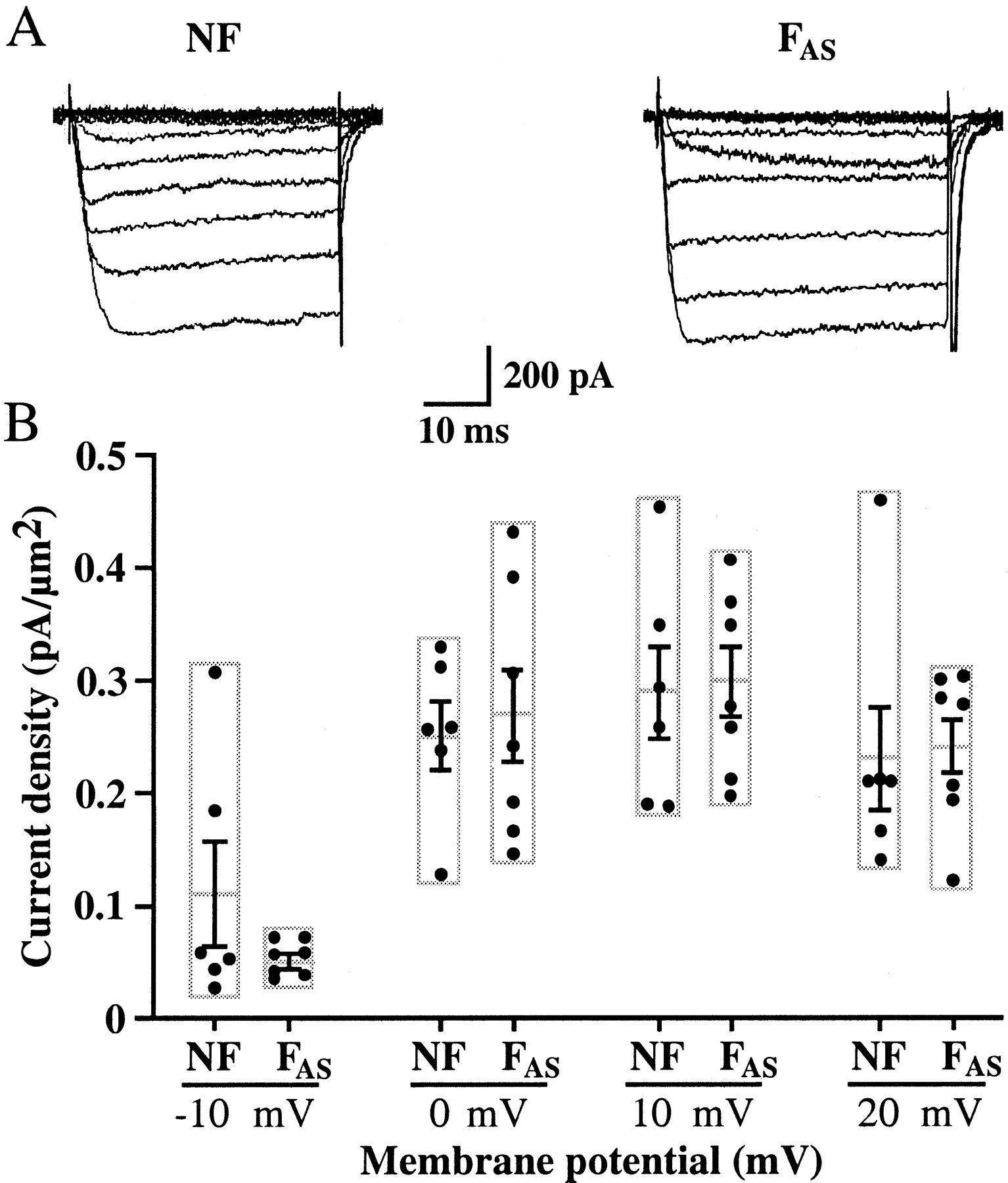 I Ca is not affected by the expression of xKv3.1 AS. A, Whole-cell voltage-clamp records of low voltage-activated and high voltage-activated calcium currents; potassium and sodium currents were suppressed pharmacologically. The records are from two neurons at 1 d in culture. Cells were held at −80 mV and stepped to potentials from −50 to +20 mV. B, Current densities for NF and FAS neurons. The records are from six and seven neurons at 1 d in culture. Conventions are as in Figure4. Mean I Ca is not significantly different for these two populations. The apparent reduction in the density of calcium current at −10 mV likely reflects outliers in the NF population. |