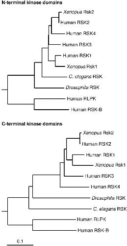 Phylogram trees for the Rsk N-terminal and C-terminal kinase domains. Neighbor-joining trees were generated from the kinase domain alignments shown in Fig. 1 by means of the Macintosh version of ClustalX. The N-terminal and C-terminal kinase domains are plotted on the same scale. The scale barrepresents 0.1 differences per site.