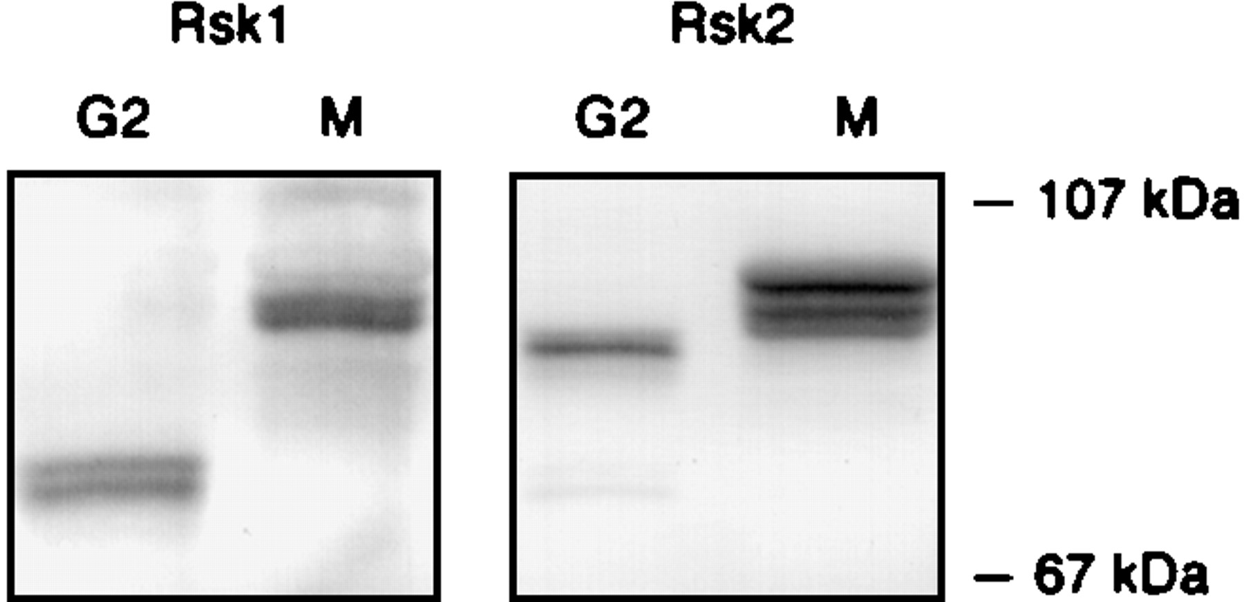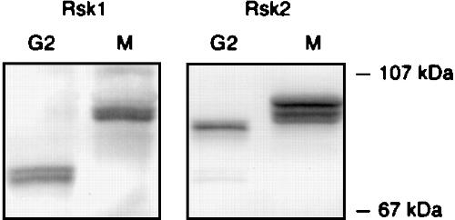 Immunoblots of Xenopus Rsk1 and Rsk2. Samples were prepared from G2 phase and M phase oocytes, blotted, and probed with human RSK1 (left) or RSK2 (right) antisera. The molecular masses shown on the right were taken from prestained molecular weight markers.
